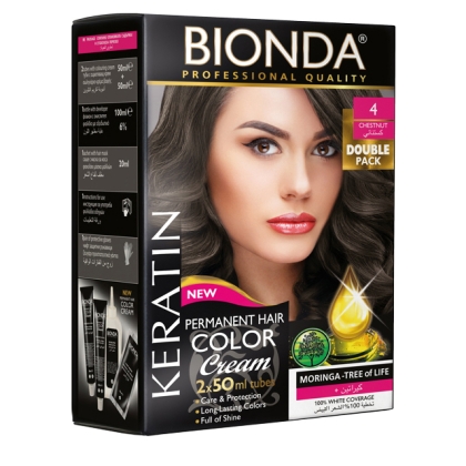 BIONDA Professional е създадена, за да ви предостави професионални резултати в комфорта на вашия дом. С тази боя вие не само ще промените цвета на косата си, но и ще я подхраните и защитите, благодарение на специалната формула, обогатена с кератин и екстракт от Moringa - Дървото на Живота.