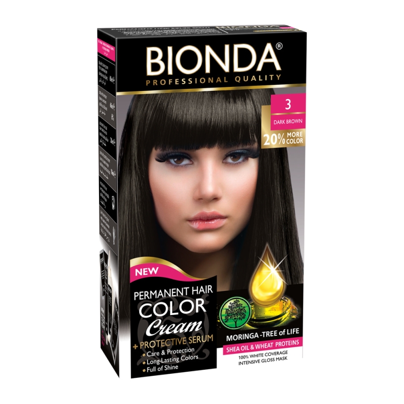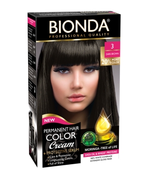 Подарете на косата си наситен, дълготраен цвят с Bionda Боя за коса - 3 Тъмно кафяв. Нашата професионална формула е създадена, за да осигури 100% покритие на белите коси и да придаде неустоим блясък на косата ви.