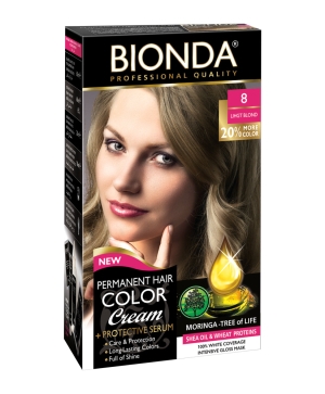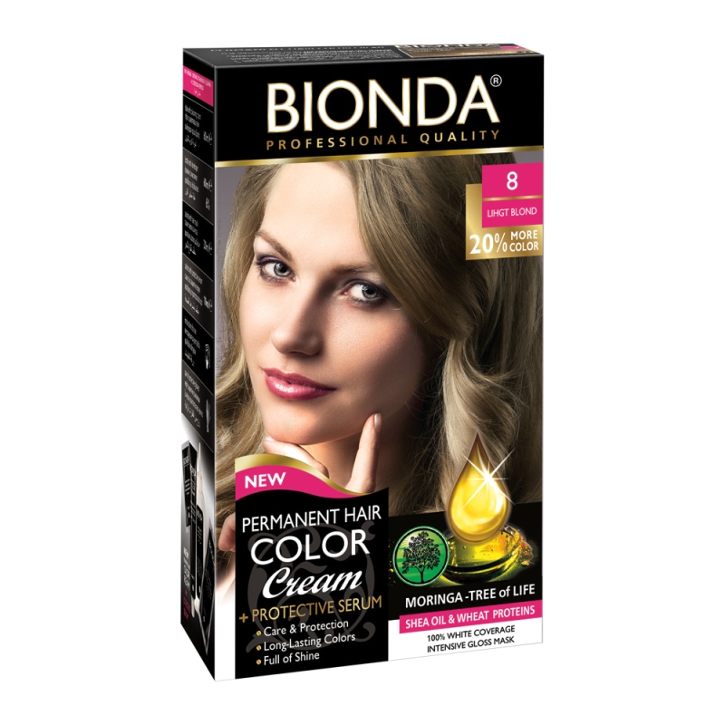 Изберете Bionda боя за коса - 8 Светло рус, за да постигнете мечтания светло рус цвят с професионално качество и дълготраен резултат. Подарете на косата си грижа и защита, които заслужава!