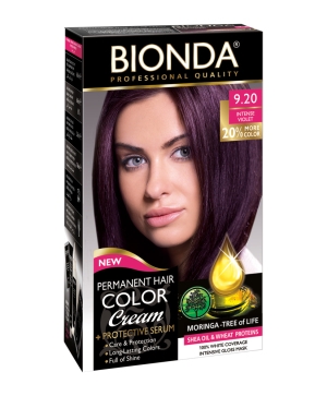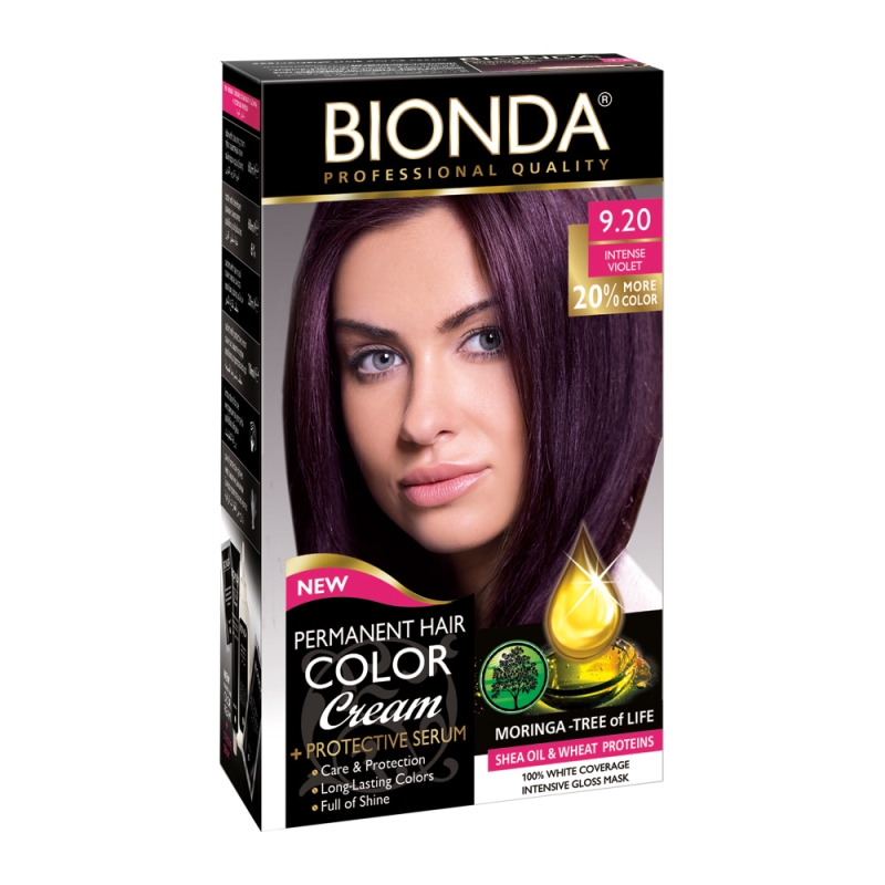 Преобразете визията си с Bionda Боя за коса 9.20 Интензивно виолетов! Насладете се на наситен и дълготраен цвят, който придава блясък и жизненост на косата ви.