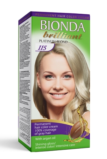 Открийте BIONDA BRILLIANT боя за коса в нюанс 115 Платинено рус. Трайна крем-боя, която предлага 100% покритие на белите коси и придава сияен блясък. Обогатена с арганово масло за подхранване и защита.