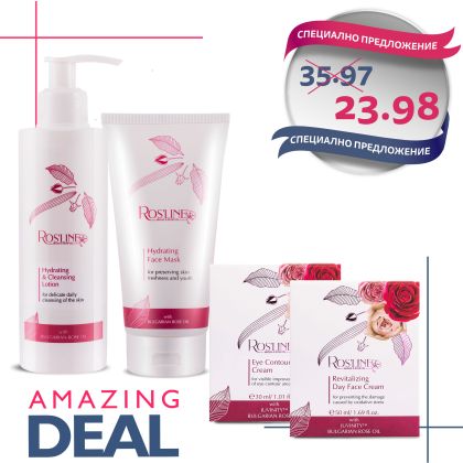 Купи Ревитализиращ дневен крем, Крем за околоочен контур, Хидратираща маска за лице и Почистващ лосион от серията Ros'line на промоционална цена!